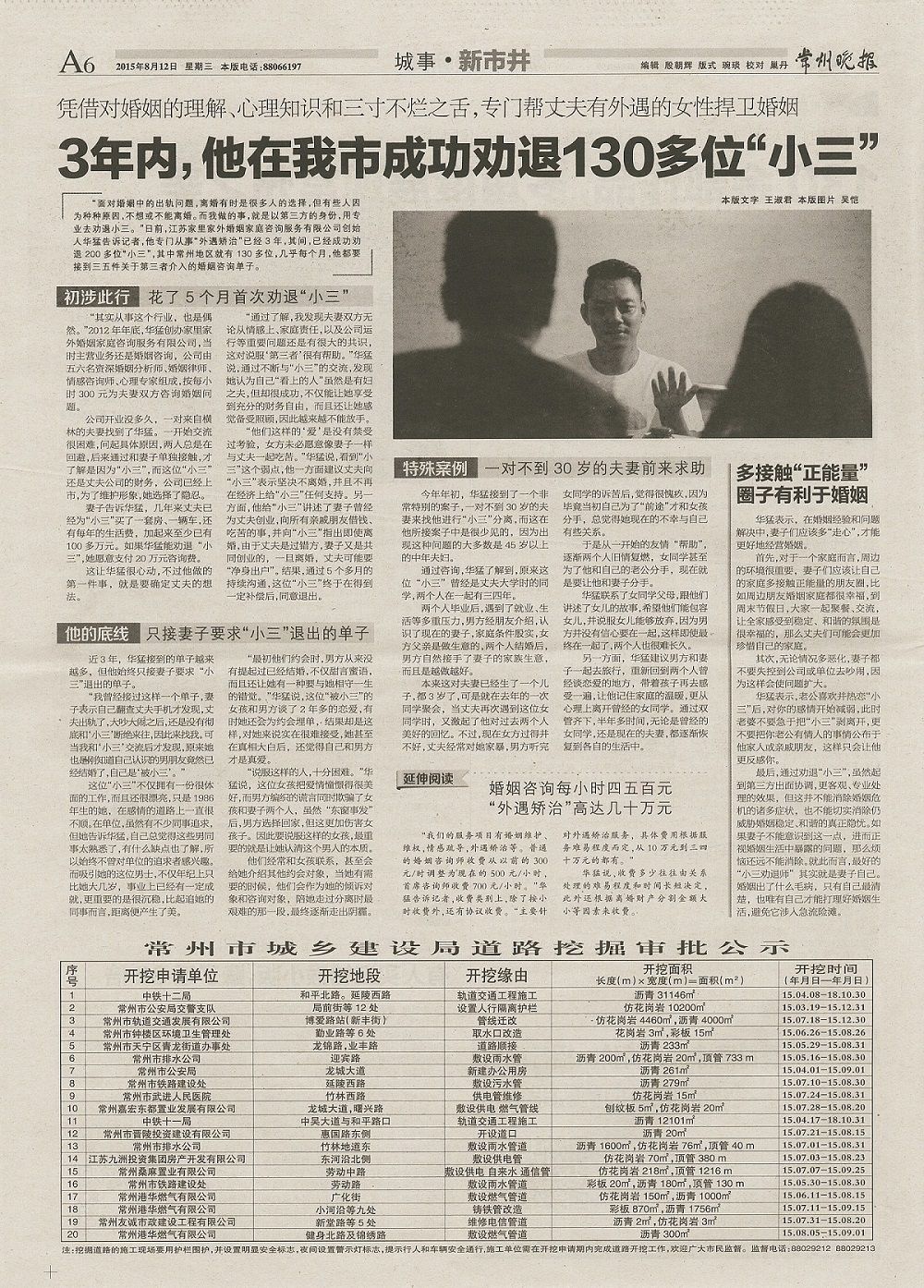常州.江苏千里眼调查名事务所:发起人-华先生(华先生)2015年8月12日A6整版《常州晚报》专栏采访报道与好评
